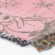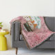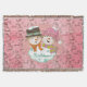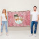 Hübsche Weihnachtsdecke mit einem Vintagen rosa Hintergrund mit kleinen Schneemännern und Schneeflocken und einem rosa-weißen Polka gepunkteten Kreis mit einer Schneemann und Schneefrau in Top-Hüten und Winterhut und Schals mit Text, der Let it Snow!