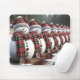 Eine Reihe fröhlicher Schneemänner mit karierten Schals und Hüten führt einen schneebedeckten Weg vor einem Hintergrund immergrüner Bäume