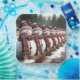 Eine Reihe fröhlicher Schneemänner mit karierten Schals und Hüten führt einen schneebedeckten Weg vor einem Hintergrund immergrüner Bäume