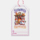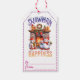 Ein schönes Weihnachtsgeschenk-Tag bietet drei fröhliche Schneemänner mit festlichen Hüten und Schals, stehend von einem gemütlichen Kamin mit einem grünen Kranz.