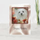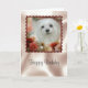 Die Geburtstagskarte zeigt ein Portrait von Snowdrop, einen kleinen maltesischen Hund mit einigen wunderschönen Blume mit weichem Fokus und einem extravaganten Skallopierrahmen.