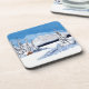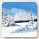 Untersetzer mit einer schönen Winterszene, einschließlich schneebedeckter Berge, rustikaler Hütte und schneebedeckter immergrüner Bäume. Das Bild und der Text können personalisiert werden. Originelle Kunst von W.B.