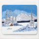 Ein Mauspad mit einer schönen Winterszene, einschließlich schneebedeckter Berge, rustikaler Hütte und schneebedeckter Immergrüner. Das Bild und der Text können personalisiert werden. Originalkunstwerk von W.B.