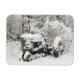 Foto eines schneebedeckten Traktors neben dem Wald.