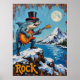 Ein auffälliges Kunstwerk, das einen Hai mit einem stilvollen Hut und einer roten Sonnenbrille darstellt und eine elektrische Gitarre meisterhaft aus einer schneebedeckten Bergkulisse "zerkleinert". Die Szene entfaltet sich über einem ruhigen, blauen Ozean, gepflückt mit Eis und weit entfernten schneebedeckten Bergen. Die künstlerische Verwendung dicker, strukturierter Pinselstriche verleiht Schnee, Wasser und Himmel eine einzigartige, fast skulpturale Qualität und steigert das Gesamtbild von "ROCK and ROLL".