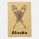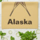 Ein gekreuztes Paar Schneeschuhe auf einer Hintergrundfarbe suggeriert braintan Leder. Es erscheint auch der Text "Alaska" mit individualisierbarem Text. Es gibt verschiedene Stile von traditionellen Schneeschuhen. Die hier abgebildeten sind aus Ash und Moosehid Babiche (Webbing) im Alaskan-Muster. Länger und dünner als andere Stile wie der Bärenjunge, Alaskan Schneeschuhe ermöglichen ein natürlicheres Tor und sind gut geeignet für Langlaufreisen. Die leicht umdrehten Spitzen erlauben es, die Füße etwas zu ziehen. Seien Sie beraten Schneeschuhe können für einen ausgezeichneten Himmel, in der Regel im schlimmstmöglichen Augenblick.