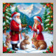 Eine wunderschöne Weihnachtsillustrierung des Weihnachtsmannes, eines kleinen Kindes und eines Kaninchens inmitten eines schneebedeckten, festlichen Hintergrunds mit Geschenken und Dekorationen.