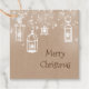Rustikale Gunst-Markierung mit handgezeichneten weißen Laternen mit Schnee auf einem Hintergrund von braunem Kraftpapier. Geeignete Gefälligkeitstafel für handgefertigte Waren wie Weihnachtsschmuck, Weihnachtsgeschenke, Holzschnitzerei, Zuhause-Dekor oder Schmuck.