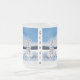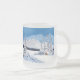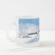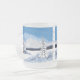 Eine Tasse mit einer wunderschönen Winterlandschaft mit schneebedeckten Bergen, Evergreens und rustikaler Hütte. Bilder und Text können angepasst, ersetzt oder gelöscht werden. Original-Kunstwerk von W.B.