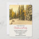 Eine weihnachtliche Party Einladung mit einem wunderschönen Naturfoto. Ein abgeschiedener Winterweg mit hohen schneebedeckten Kiefern. Eine goldene Dämmerung schafft ein zauberhaftes Gefühl für dieses Foto.