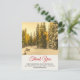 Vielen Dank Postkarte mit einem schönen Naturfoto. Ein abgeschiedener Winterweg mit hohen schneebedeckten Kiefern. Eine goldene Dämmerung schafft ein zauberhaftes Gefühl für dieses Foto.