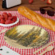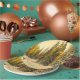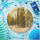 Papier Teller mit einem schönen Naturfoto. Ein abgeschiedener Winterweg mit hohen schneebedeckten Kiefern. Eine goldene Dämmerung schafft ein zauberhaftes Gefühl für dieses Foto.