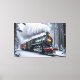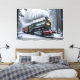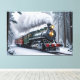 Ein Winterwunderland-Kunstwerk, das einen Schneezug einfangen lässt, der durch ein malerisches Winterwunderland fährt.