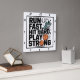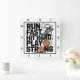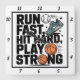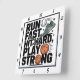 Diese weiße Wanduhr enthält den Text "RUN FAST HIT HARD PLAY STRONG" in einem fett schwarzen Schriftart gestapelt. In dem Text sind Grafiken, die verschiedene Sportarten darstellen: ein Baseball, ein Laufschuh und zwei Basketbälle. Kleine Sternexplosionen fügen dem Design ein dynamisches Element hinzu, das Energie und Athletik für verschiedene Sportarten nahe legt.