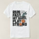 Dieser weiße T - Shirt enthält den Text "RUN FAST HIT HARD PLAY STRONG", der in einem fett schwarzen Schriftart gestapelt ist. In dem Text sind Grafiken, die verschiedene Sportarten darstellen: ein Baseball, ein Laufschuh und zwei Basketbälle. Kleine Sternexplosionen fügen dem Design ein dynamisches Element hinzu, das Energie und Athletik für verschiedene Sportarten nahe legt.