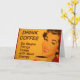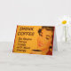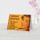 Eine lächelnde Frau mit Retro-rotem Lippenstift und Nägeln trinkt ihre Tasse Morgenkaffee. Die Überschrift lautet: "Trink Kaffee - Mach die Dummheiten schneller mit mehr Energie."