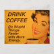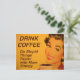 Frau mit hellroten Lippen hält eine Tasse Kaffee. "Mach die Dummheiten schneller und mit mehr Energie."