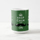 Grüner, schwarzer Schnurrbart auf Keep Ruhe und machen Slogan mit ursprünglichen britischen Kriegs-Plakatgraphiken auf einer Tasse weiter. Elke Clarke ©2012. Eine lustige Spaß-Tasse macht ein großes motivierend Geschenk für die gleichschnurrbartliebhaber und Schnurrbartträger. Für andere Farben treten Sie mit Geschäftsinhaber in Verbindung.