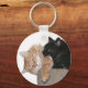 Eine orangefarbene, langhaarige Katze und eine schwarze Katze schnauzen sich in ihrem Katzenbaum zusammen, weil sie außerhalb des Schlüsselanhängers des Fotos kalt ist