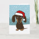 Diese bezaubernde Weihnachtskarte ist perfekt für Schokoladenliebhaber, die Dackel lieben. Das von Hand gezeichnet Bild des festlichen und liebenswerten Dackel-Hundes mit einer Weihnachtsmannmütze fängt den verspielten Geist der Ferien ein. Passen Sie das Innere mit Ihren eigenen, durchdachten Gefühlen an, um in dieser Saison allen Freude zu vermitteln, die auf Ihrer Liste stehen. Ideal für Tierärzte, Hundeschuhwanderer, Tiersitter und vieles mehr, um sie an ihre Kunden und ihre wertvollen Pools zu schicken. Diese fröhliche Karte zelebriert den einzigartigen Charme der Dackel, die jedem Empfänger ein Lächeln auf die Stirn bringt.