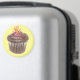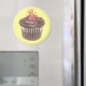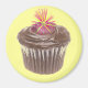 Feuerwerk Schokolade Schokolade Schokolade Icing Magnet. Mund gießen echte Schokoladenkuchen und dick wirbeliges Eisen in einer Papierbacktasse. Hinter einem roten und gelben Feuerwerk, anstelle einer Kirsche oder Sprinklen. Wählen Sie aus runden oder quadratischen Magneten in verschiedenen Größen.
