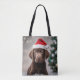 Niedliche Schokolade Labrador Welpe mit einer Weihnachtsmannmütze.