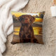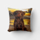 Ein schokoladenbrauner Labrador Retriever sitzt auf einem Sandstrand und blickt eindringlich auf die Kamera. Das Fell des Hundes ist reich braun und kontrastiert mit den goldenen Farbtönen der untergehenden Sonne. Der Himmel ist von blühenden orangen und rosa Wolken übersät, die im feuchten Sand reflektieren. Das Meer weht sanft am Ufer, was eine ruhige und ruhige Atmosphäre schafft. Ideal für Arbeitsuchende.