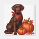 Adorable Schokolade Labrador Retriever mit einer lebendigen roten Bandana sitzend neben hellen orangefarbenen Kürbissen mit gefallenen Herbstblättern, verströmt gemütliche saisonale Atmosphäre und reflektiert das Wesen der Herbst-und Erntezeit.