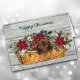 Die Vorderseite dieser lustigen Holiday Grußkarte hat ein schönes Bild von einem kleinen Schokoladen Labrador Retriever Welpe in einem Korb. Der Korb ist mit Blumenbouquets aus Poinsettia dekoriert. Der anpassbare Text über dem Bild sagt "Happy Christmas" in grüner Schrift. Alles ist auf einem rustikal-grauen Holzpaneelboden platziert. Im Inneren stehen Ihnen zwei weitere Textfelder zur Verfügung, die Sie nach Belieben anpassen können.