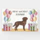 Desteis originelle Cartoon-Illustration eines niedlichen Schokoladenbraun Labrador Retriever Rasse Hund. Der Hund wird in einer bunten Geburtstagslandschaft mit pastellfarbenen Geburtstagsballons und Geschenken platziert. Die Pastellfarben Rosa, Grün, Blau, Rot, Orange und lila. Der Hund ist auf einer gelben Holzfußboden-Textur stehend und der Hintergrund hat ein spielerisches pastellfarbenes Polka-Punktmuster. Es gibt auch einen personalisierbaren Textbereich.