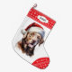 Die Vorderseite dieses Holiday Strumpfs zeigt ein Bild eines schokoladen Labrador Retriever mit einer Weihnachtsmannmütze. Das Bild wird auf einem weißen Hintergrund platziert, und der Zehen- und Oberrand sind ein rotes und weißes Schneeflockenmuster. An der oberen Grenze befindet sich ein weißes Etikett mit Ihrem benutzerdefinierten Text. Die Rückseite des Strumpfs ist das gleiche rote und weiße Schneeflockenmuster.