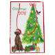 Auf jeder Seite dieses Holiday Geschenksacks trägt ein niedlicher Schokolade Labrador Retriever Welpe eine Weihnachtsmannmütze, während er neben einem Holiday Baum sitzt. Rund um den Hund herum gibt es leicht gewickelte Geschenkpakete. Auf dem Weihnachtsbaum landet eine Stierfinke. Der rote und grüne Text sagt "Christmas JOY".