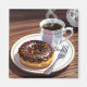 Ein niedlicher Schokolade-mattierter Donut-Magnet. Eine schöne Abbildung einer Schokolade neben einer Tasse warmen Kaffee.