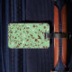 Ein schönes, schlichtes, abstraktes antikes Design von Reben, Blume und Blätter in einem reichen, abfallenden Braun auf einem schönen, minzgrünen Hintergrund