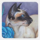 Original Aquarellmalerei von Sandra Gale, mit einem Schokoladenpoint Siamesen Katze, umgeben von blauen Blumen auf einem hellen lila Hintergrund. Blume sind blaue Hydrangea, blaue Mohn und eine blaue Rose. Das Design ist perfekt für Katzenliebhaber und diejenigen, die die siamesische Rasse besonders mögen. Ideal für Schlafzimmerwandkunst oder gerahmt mit passendem Bild. Die passende Aquarellmalerei eines Blaupunktes Siamese ist auch in meinem EverIrisPrints Shop erhältlich.