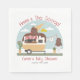 Eiscreme-thematisierte geschlechtsneutrale Babydusche mit Abbildung eines Campers mit Schokoladencremekonus auf der Oberseite und Babykleidung, die von der Wäscheleine hängt, die an gigantischen Eisdielen mit Kakteen in Kegelbehältern befestigt ist.