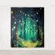 Ein schöner Abend für eine Hochzeit, mit einem Waldweg, der mit Lichterketten in den Bäumen geschmückt ist und eine atemberaubende Kulisse schafft. Ein leichter Nebel hängt im Hintergrund des Waldes, mit unzähligen Bäumen und Lichtern, die elegant von ihren Ästen hängen.