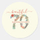 Aufkleber für die 70. Geburtstagsfeier mit der Nachricht "Beautiful" in der modernen Kalligraphie Drehbuch "at" dann Geburtstagsgal Name in der Mitte der Zahl 70 (mit Blumenbriefen).