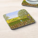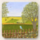 Ein Untersetzer mit einem wunderschönen Bild einer Naturlandschaft: Ein Vogel, der auf einem verwitterten Zaun sitzt, Wildblumen, die um den Zaun wachsen, ein Bauer auf einem Traktor, der sein Land bearbeitet, Bäume mit Blätter und Bauernland mit verschiedenen Farben. Original-Kunstwerk von W.B.