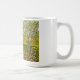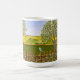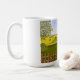 Eine Tasse mit einem wunderschönen Bild einer Naturlandschaft: Ein Vogel, der auf einem verwitterten Zaun sitzt, Wildblumen, die um den Zaun wachsen, ein Bauer auf einem Traktor, der sein Land bearbeitet, Bäume mit Blätter, und Bauernland mit verschiedenen Farben. Hintergrund und Bild können angepasst werden. Text kann hinzugefügt werden. Original-Kunstwerk von W.B.