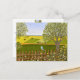 Eine Karte mit einem schönen Bild einer Naturszene: Ein Vogel sitzt auf einem verwitterten Zaun, Wildblumen wachsen um den Zaun herum, ein Bauer auf einem Traktor bearbeitet sein Land, Bäume mit Blättern und Ackerland in verschiedenen Farben. Originalkunstwerk von W.B.