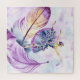 Schöne tanzende Ballerina mit Federn, schwieriges Rätsel. Die Ballerina ist in einem blauen Kleid mit Blume und Lavendel besetzt. Der Hintergrund passt zu den Farben der Federn und der Ballerina. Ein Rätsel, das es wert ist, nach Fertigstellung an Ihrer Wand hängen zu können. Dank Creative Fabrica für die Elemente im Design.