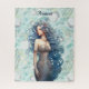Eine schöne Meerjungfrau mit lang fließendem blauen Haar vor einem Hintergrund von aquamarin mit Muschel und Frondmuster.