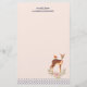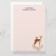 Papier aus Papier mit einer schönen braunen Dose mit weißen Flecken auf ihrem Fell. Ein niedlicher Vogel sitzt auf dem Rücken des Hirsches. Eine elegante Blume bestehend aus Aquarellfarben-Rose und hellgrünen Blätter unter ihren Füßen. Ein blauer Polka-Punkt-Rand mit pfirsichfarbenem Hintergrund. Schmuckhaftes Design. Personalisieren mit einem Namen.