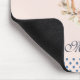 Personalisierte Mousepad mit einer schönen braunen Dose mit weißen Flecken auf ihrem Fell. Ein niedlicher Vogel sitzt auf dem Rücken des Hirsches. Eine elegante Blume bestehend aus Aquarellfarben-Rose und hellgrünen Blätter unter ihren Füßen. Ein blauer Polka-Punkt-Rand mit pfirsichfarbenem Hintergrund. Schmuckhaftes Design.