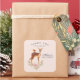 Babydusche danke einem Aufkleber mit einer schönen braunen Dose mit weißen Flecken auf ihrem Fell. Ein niedlicher Vogel sitzt auf dem Rücken des Hirsches. Eine elegante Blume bestehend aus Aquarellfarben-Rose und hellgrünen Blätter unter ihren Füßen. Ein pfirsichfarbener Hintergrund. Schmuckhaftes Design.