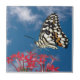 Ein nahes Foto eines bunten Schmetterlings, der auf einer Blume vor blauem Himmelshintergrund füttre.