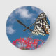 Ein nahes Foto eines bunten Schmetterlings, der auf einer Blume vor blauem Himmelshintergrund füttre.