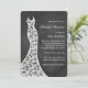 Ein schönes Hochzeitskleid aus Spitzen auf einem Kalkbrett unterstreicht diese Brautdusche-Einladung. Scrollen Sie nach unten, um zu sehen, welche Elemente koordinieren.