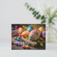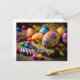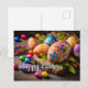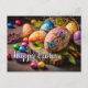 Auf dieser Postkarte finden Sie einige bunte Ostereier, frische Blume und eine kleine Süßigkeiten.